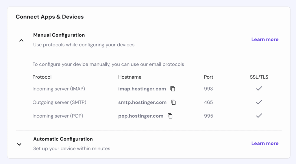 - Look for the Manual Configuration section to find the incoming and outgoing server details.